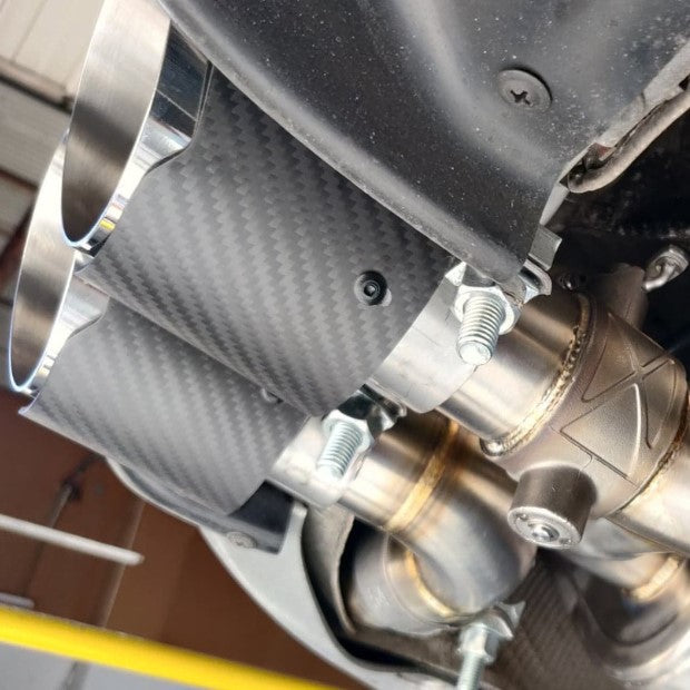 Finished with quad 89mm (3.5") matte dry carbon fiber tips, mandrel-bent piping, and precision TIG-welded construction, this exhaust delivers exceptional build quality and an aggressive sound.